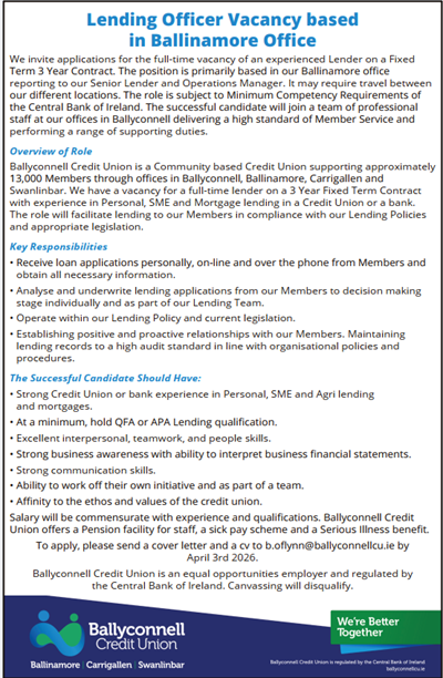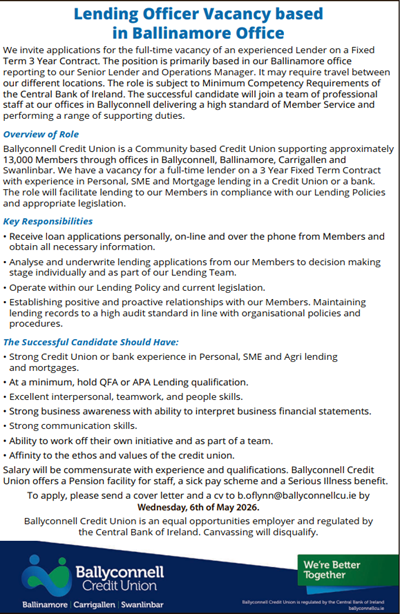 Ballyconnell Credit Union Ltd is Regulated by the Central Bank of Ireland. Reg No. 422CU