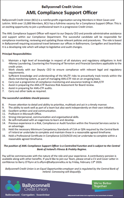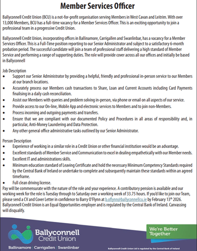 Ballyconnell Credit Union Ltd is Regulated by the Central Bank of Ireland. Reg No. 422CU