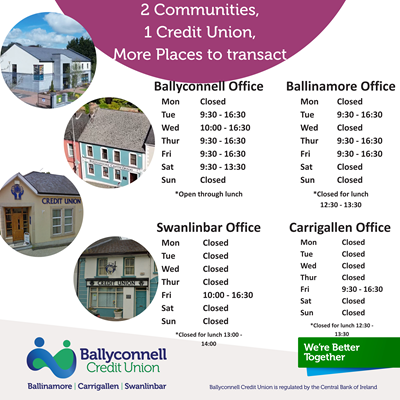 Did you know that at Ballyconnell Credit Union, you now have more choice than ever where to transact? Our 4 branches are opened throughout the week, including weekends in certain branches, meaning you have more choice and freedom when it comes to your money. See below for opening times.